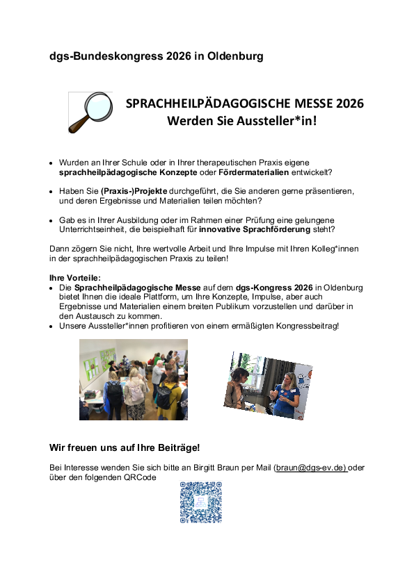 Die Sprachheilpädagogische Messe auf dem dgs-Kongress 2026 in Oldenburg bietet Ihnen die ideale Plattform, um Ihre Konzepte, Impulse, aber auch Ergebnisse und Materialien einem breiten Publikum vorzustellen und darüber in den Austausch zu kommen.