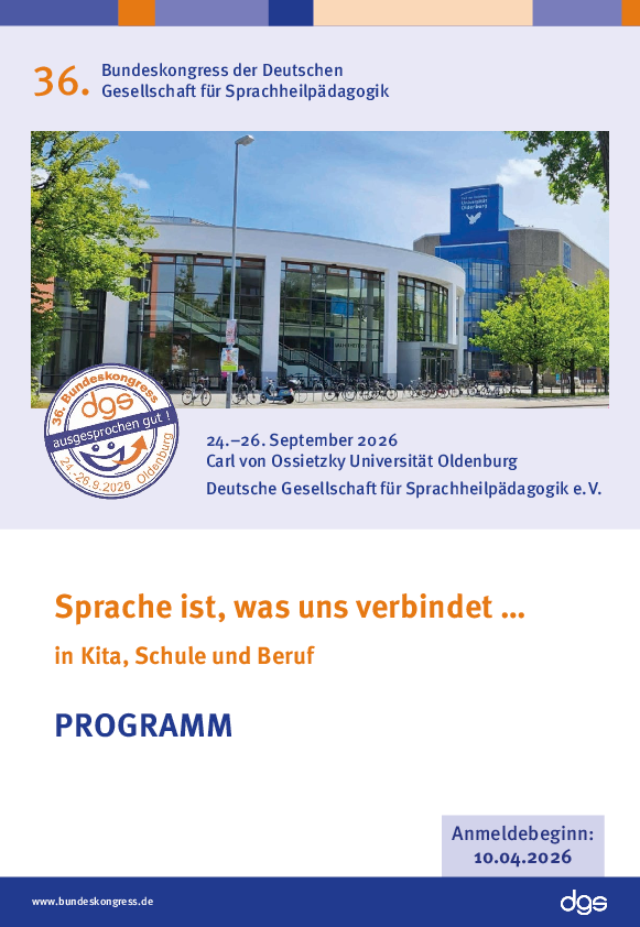 Hier erhalten Sie aktuelle Informationen zum detaillierten Programm mit 3 Keynotes, 18 Workshops, 11 thematischen Vortragssessions mit jeweils vier Beiträgen sowie zu den am Freitag, den 25.09.2026 parallel stattfindenden Formaten Postersession, Sprachheilpädagogischen Messe und NEU: dem Sprach-Café.