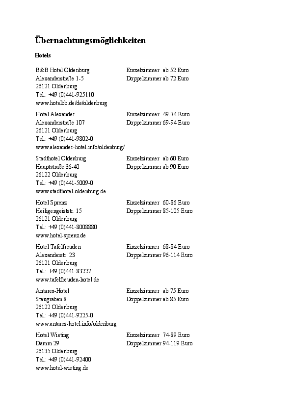 Das Tourismusbüro Oldenburg bietet eine Liste von Übernachtungsmöglichkeiten an. Diese finden Sie hier im Download oder durch einen Mausklick auf die rechts stehende Grafik.